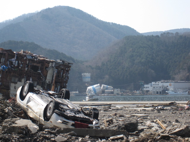 道路はきれいに片づけてあるものの、道路脇にめをやるとがれきの山です。car on the car です。